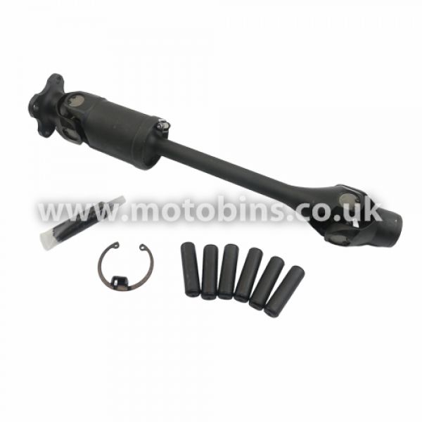 Driveshaft with rebuilable universal joint *** Due to the very robust universal joint bearings these drive shafts are slightly bigger across the bearing than the original and this means the drive shaft will only pass through the swing arm at an angle of 45°. The easiest way to fit one is to pass the shaft through the swing arm away from the bike before connecting the driveshaft to the gearbox and the swing arm to its bearings. ***